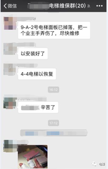 物業(yè)打電話給電梯維保公司,反映電梯操作箱面板已掉落,把一個(gè)業(yè)主手弄傷了,且把手指受傷的圖片發(fā)給了電梯公司。
